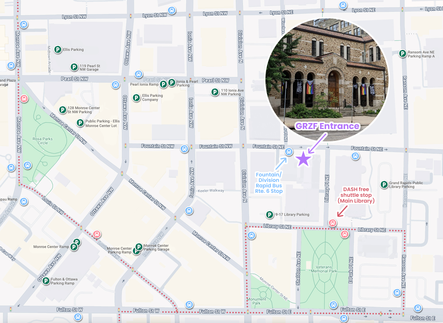 *Note: Division St. from Fulton St. to Michigan St. will be closed for construction from March to November 2025, so during this year’s GRZF, the Division/Rapid bus stop will not be operating. The DASH Main Library stops will remain active, just detouring to Sheldon Ave and E. Park Pl instead.